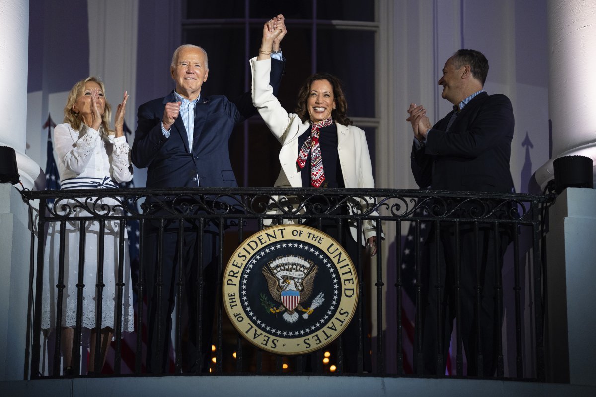 조 바이든 미국 대통령의 부인 질 여사, 바이든 대통령, 카멀라 해리스 부통령, 해리스 부통령의 남편 더글러스 엠호프 변호사(왼쪽부터)가 4일(현지 시간) 워싱턴 백악관에서 열린 독립기념일 행사에 등장해 지지층에게 손을 들어 보이고 있다. 사진 출처 워싱턴=AP 뉴시스