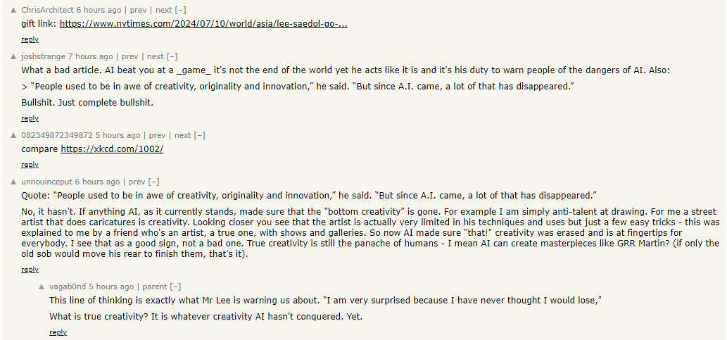 레딧의 한 사용자는 "새로운 기술이 시장에 나올 때마다 이런 종말론적 예측이 난무한다"라며 "AI가 모든 것을 끝낼 것으로 예측하는 것은 명백하게 틀렸다"고 비난했습니다. 또 다른 사용자는 "AI가 진짜 인간 창의성을 죽일 만큼 대단한 것을 내놓았는가"라며 "AI가 죽인 창의성이란 최하위급 창의성"이라고 말했습니다.