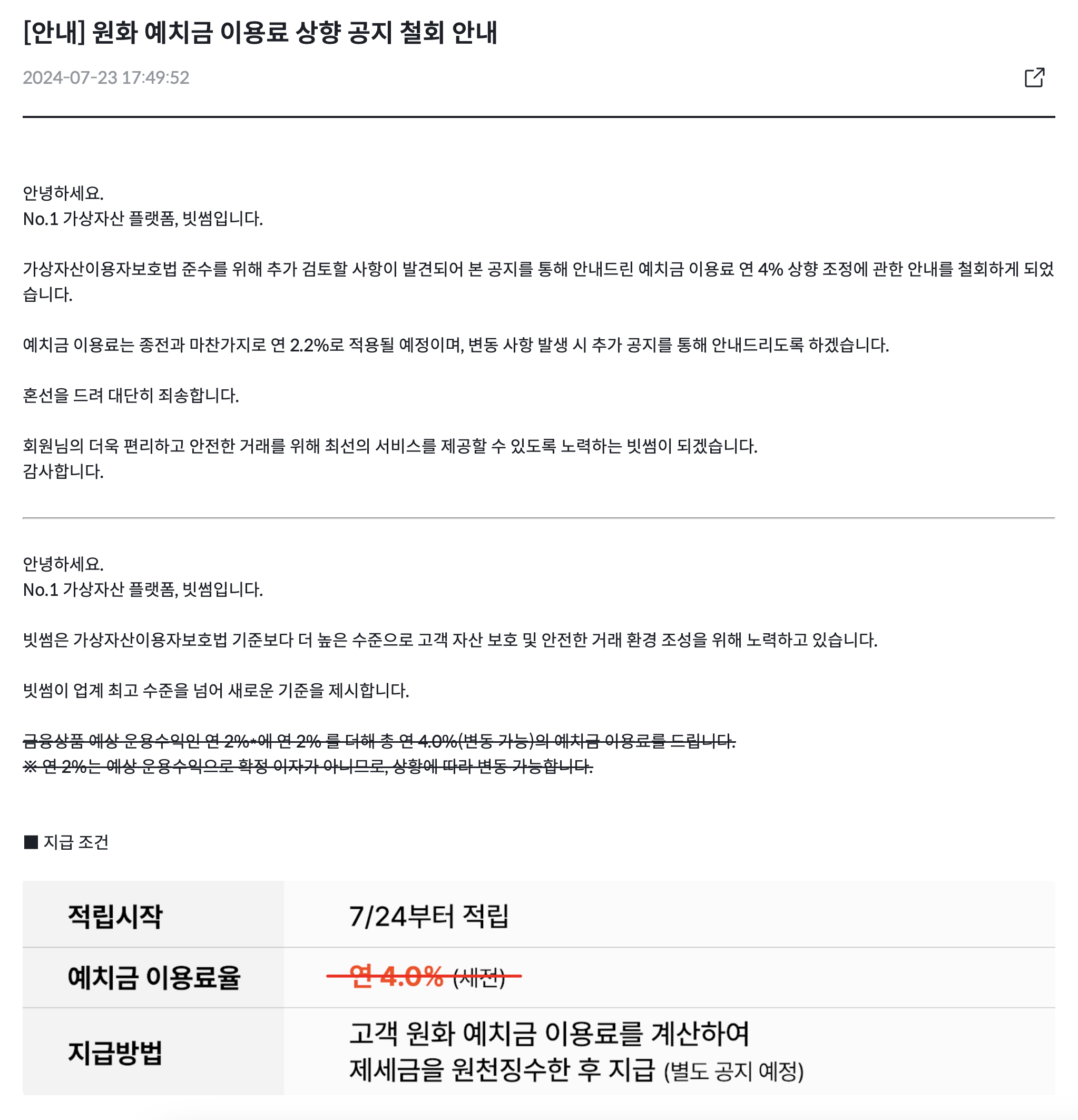 빗썸은 23일 오후 5시 50분경 기존 연 2.2%였던 원화 예치금 이용료율을 연 4.0%로 상향한다고 발표했습니다. 이 결정은 제휴 은행인 NH농협은행의 연 2.0% 이자에 빗썸이 자체적으로 연 2.0%를 더해 최종적으로 연 4.0%의 이용료를 지급하겠다는 계획이었습니다. 그러나, 같은 날 밤 12시경 빗썸은 이 결정을 철회한다고 발표했습니다. 이는 이용료율 인상을 발표한 지 약 6시간 만의 번복이었습니다.