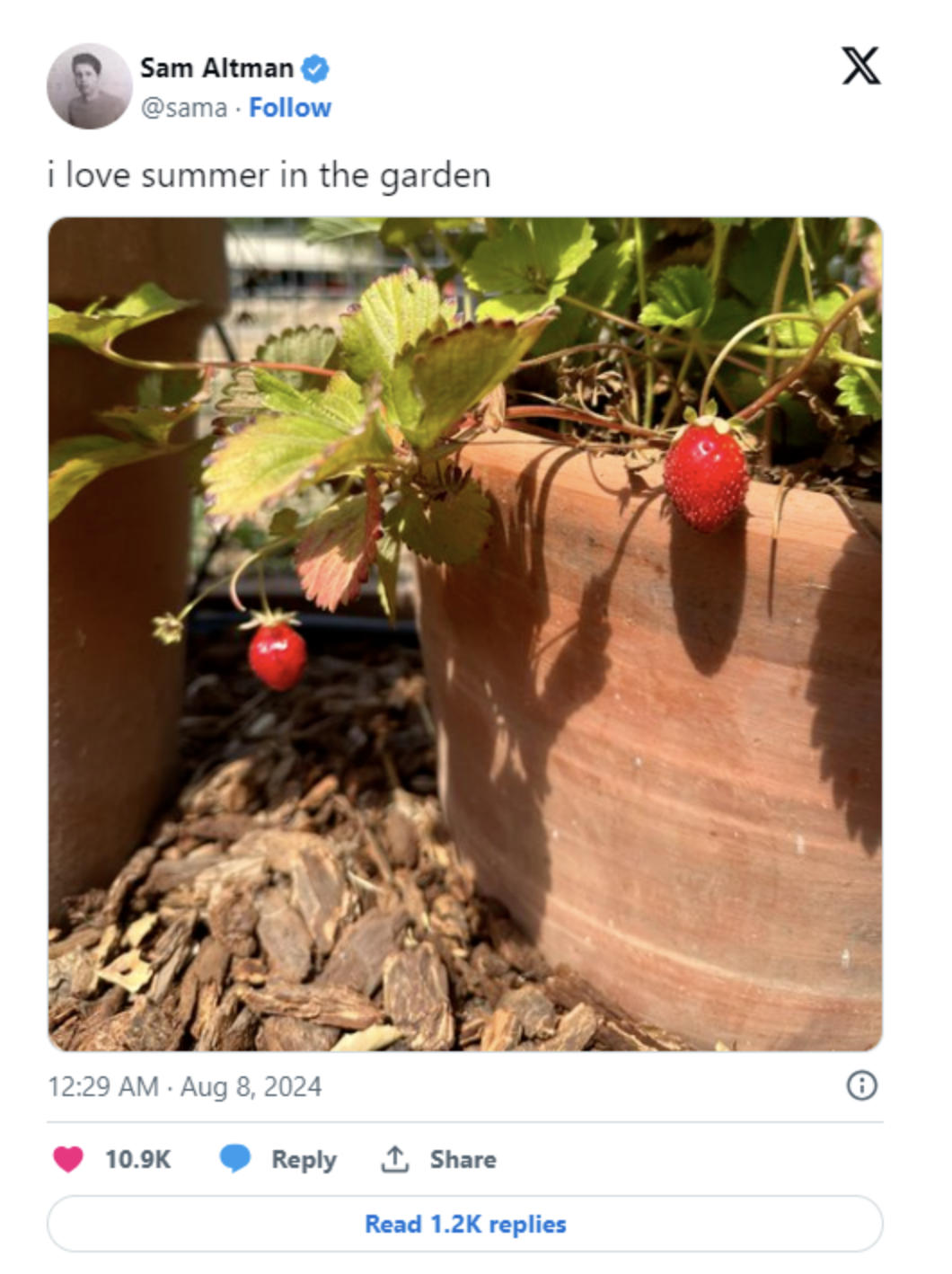 알트먼 CEO가 게시한 스트로베리 사진. 업계에서는 이를 스트로베리 프로젝트를 암시하는 것으로 보고 있다. [사진=엑스 갈무리] 출처 : 테크월드뉴스(https://www.epnc.co.kr)