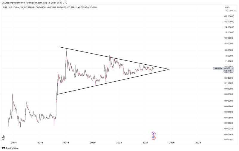 코인 전문매체 유투데이(U.Today)는 XRP의 차트를 분석하며, 2018년의 사례를 고려할 때 현재의 상승 추세가 지속될 가능성이 크다고 전했습니다. 2017년에서 2018년까지 약 315일 동안 XRP의 가격은 무려 60,000% 상승한 바 있습니다. 이번 대칭형 삼각형 패턴이 완료되면, XRP에 대한 강력한 상승 모멘텀이 형성될 것으로 기대됩니다.