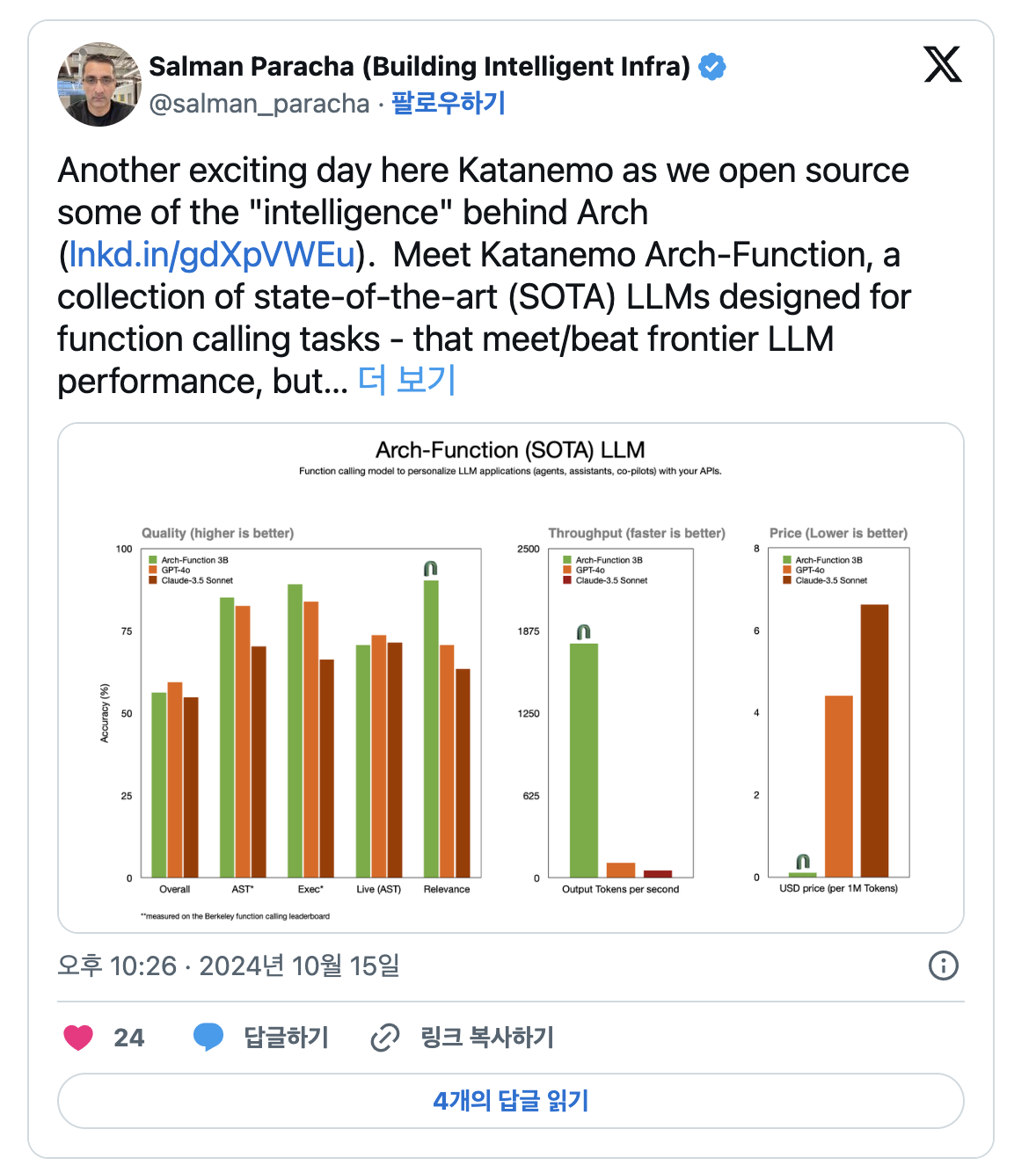 AI 스타트업 카타네모가 AI 기술 분야에서 또 한 번의 혁신을 이끌어냈습니다. 카타네모는 최근 기존의 대형언어모델(LLM)보다 훨씬 빠르고 효율적인 '아치-함수' 시리즈를 오픈 소스로 출시했습니다. 이 모델은 AI 에이전트를 구축하는 데 필요한 함수 호출을 최적화하여, 기존의 LLM 모델보다 최대 12배 더 빠른 속도로 작업을 처리할 수 있다고 합니다.