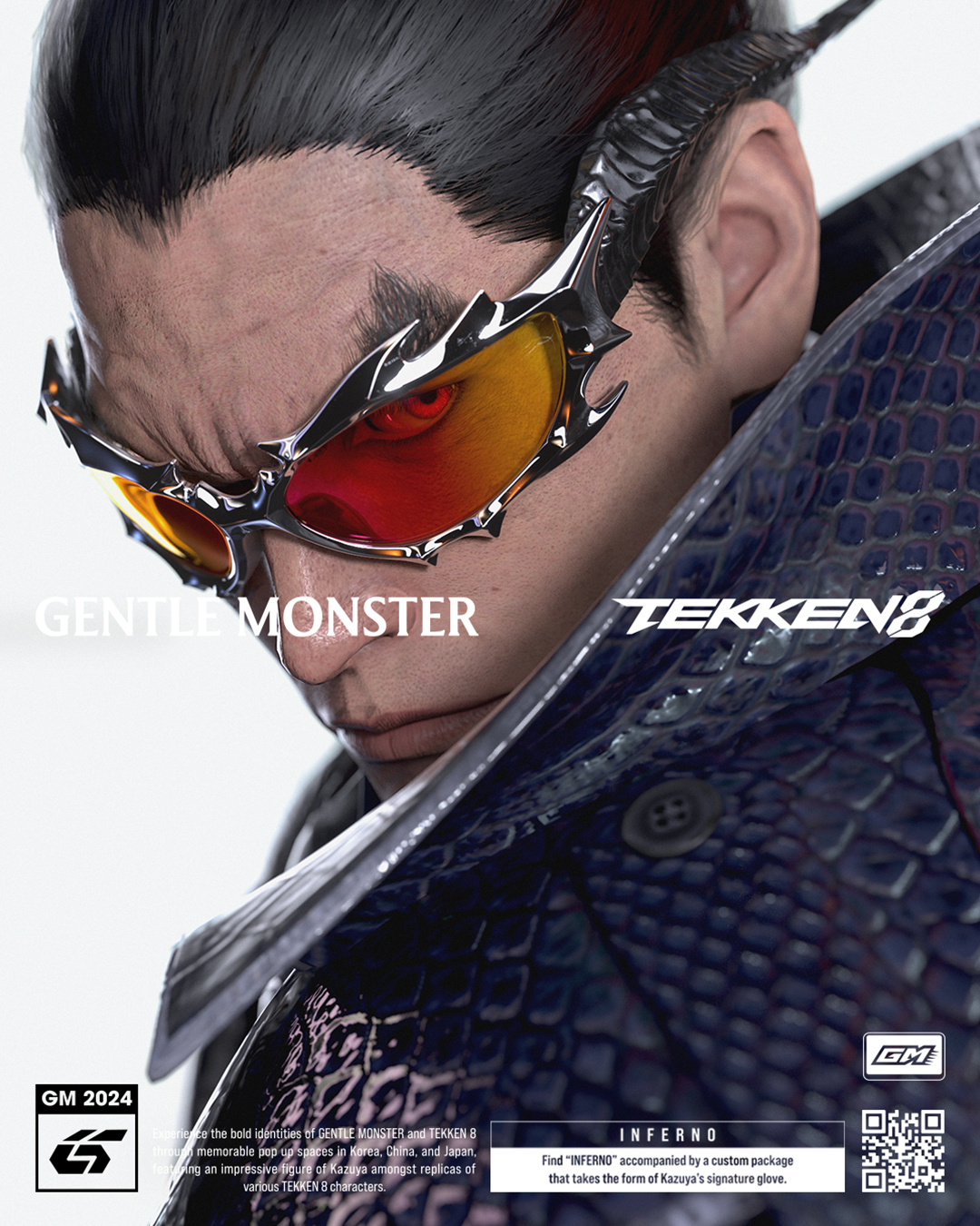 이번 협업의 핵심 제품은 젠틀몬스터가 선보인 한정판 선글라스 ‘인페르노(Inferno)’입니다. 이 제품은 철권 8의 캐릭터 카즈야(Kazuya)의 데빌 버전에서 영감을 받아 디자인되었습니다. 특히, 카즈야의 데빌 뿔을 형상화한 요소가 인페르노 선글라스에 녹아 있어 더욱 독특한 스타일을 자랑합니다.