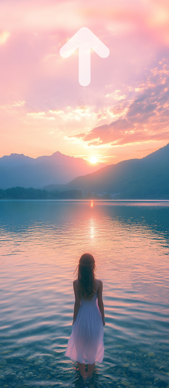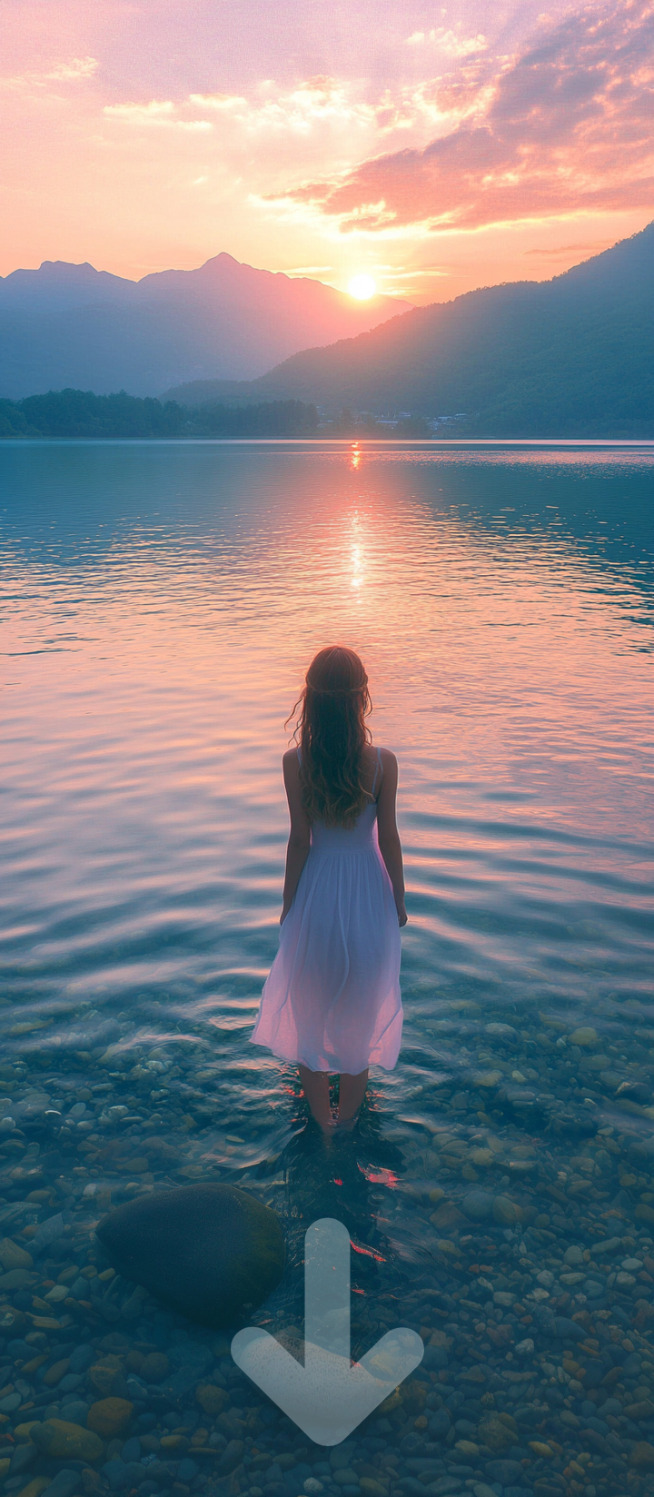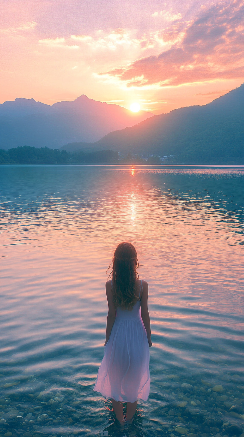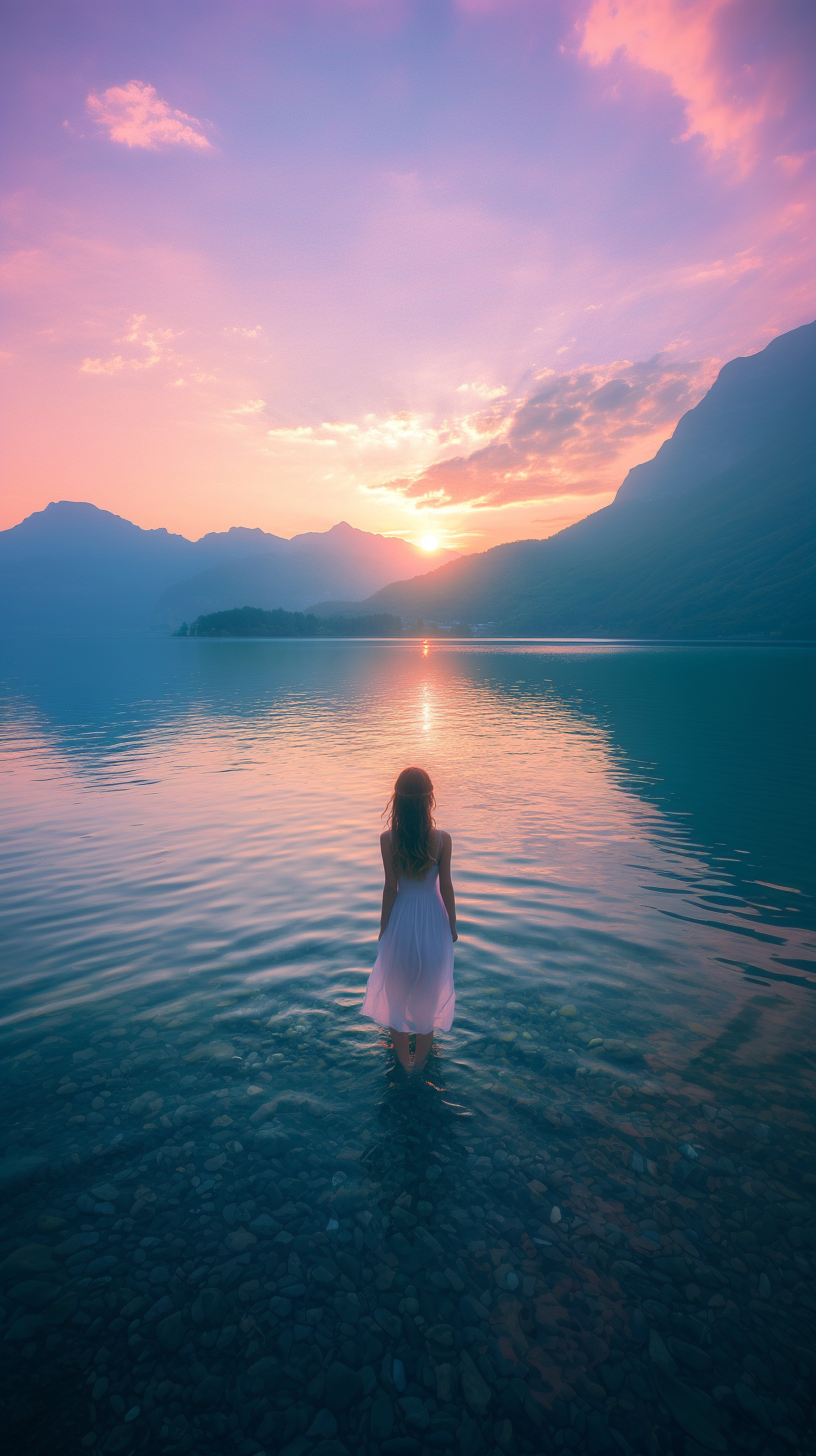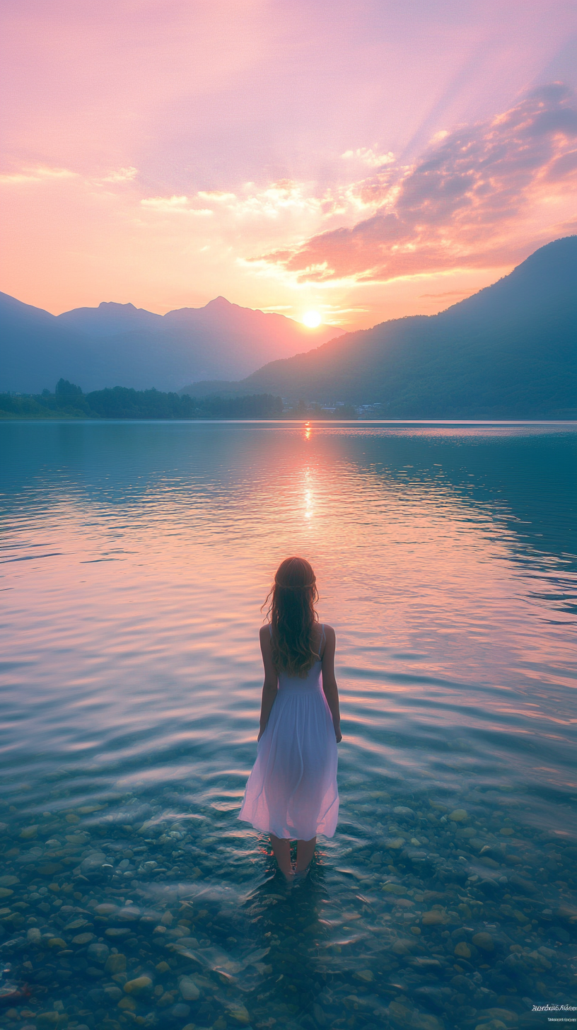 미드저니 프롬프트 : A beautiful girl in the morning. Arrived at the clear lake. The scenery is beautiful, the mountains in the distance go, and the sunrise rises