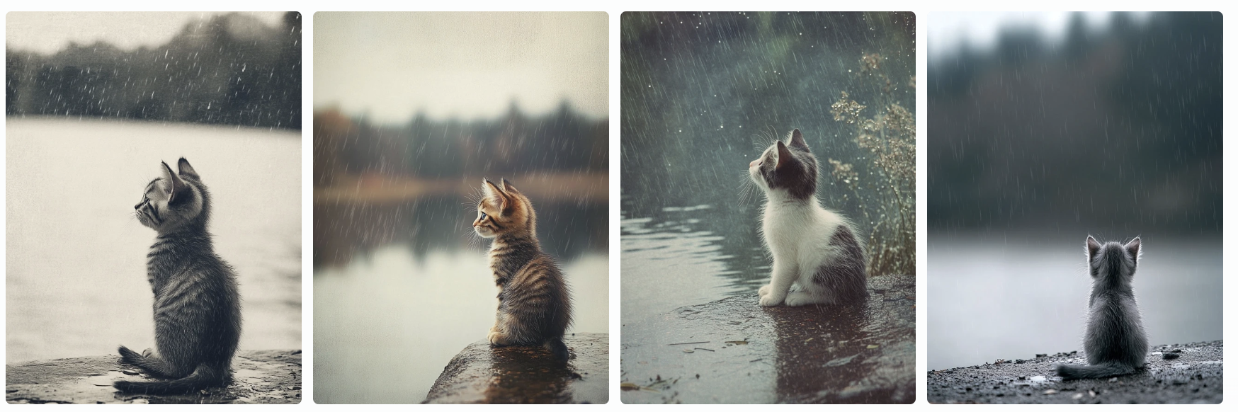 • 프롬프트 예시: “Kitten sitting on the shore of a calm lake, rainy afternoon, wet fur, rain water marks, Real photo images, fine detail”