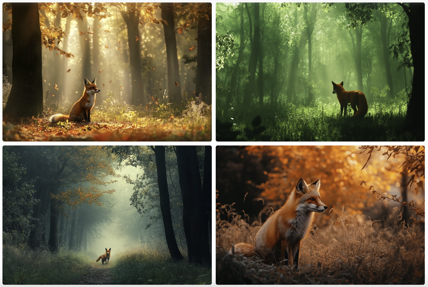 이 프롬프트에서는 “숲”이 주요 비중을 가지며 “여우”가 보조적으로 나타나도록 설정했습니다. 반면, “산”은 마이너스 가중치를 부여하여 이미지에서 최소화하거나 제외하도록 했습니다. 이를 통해 숲속에서 여우가 등장하는 장면을 강조하면서도 배경에 산이 두드러지지 않게 만들 수 있습니다. 숲의 분위기를 메인으로 하고 싶을 때 유용합니다.