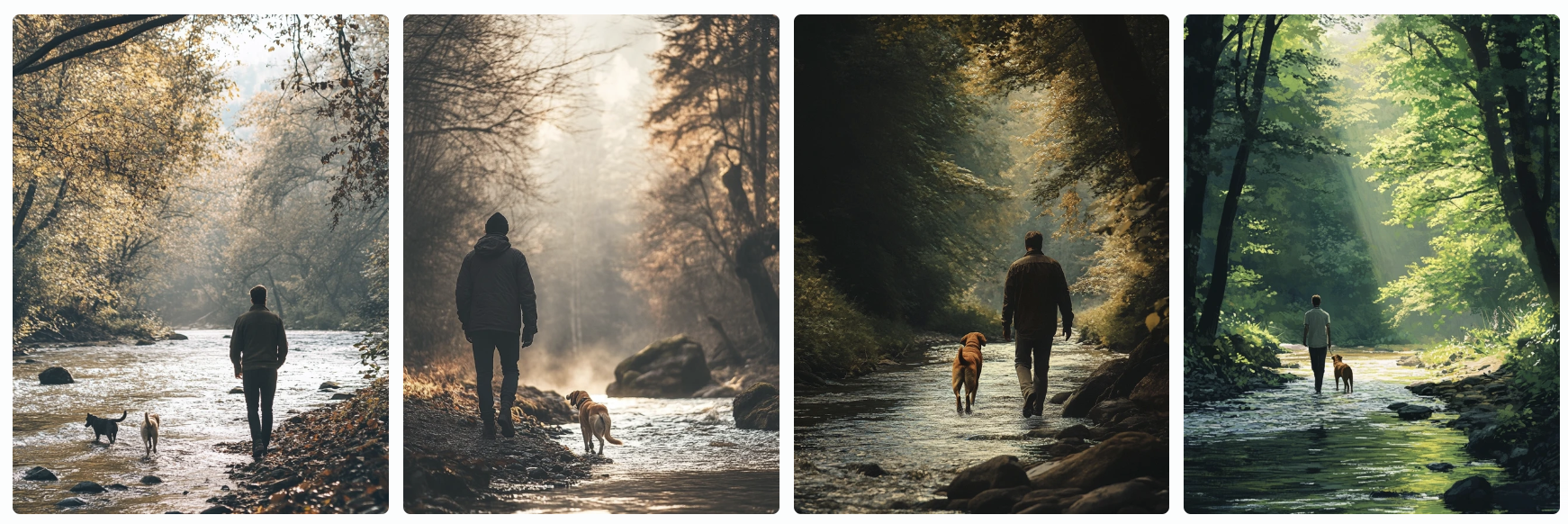 프롬프트 예시 : inner forest, natural light background, dog and man walking by the river, cinematic