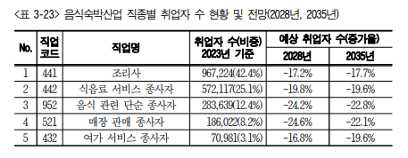 한국고용정보원의 연구에 따르면, 음식숙박업의 고용은 AI와 자동화 기술로 인해 2028년까지 약 14.7% 감소할 것으로 예측됩니다. 이 분야에서 단순 반복 업무를 수행하는 직종이 가장 큰 타격을 받을 것으로 보이며, 특히 음식 준비와 매장 판매 관련 종사자들의 고용이 줄어들 가능성이 높습니다.