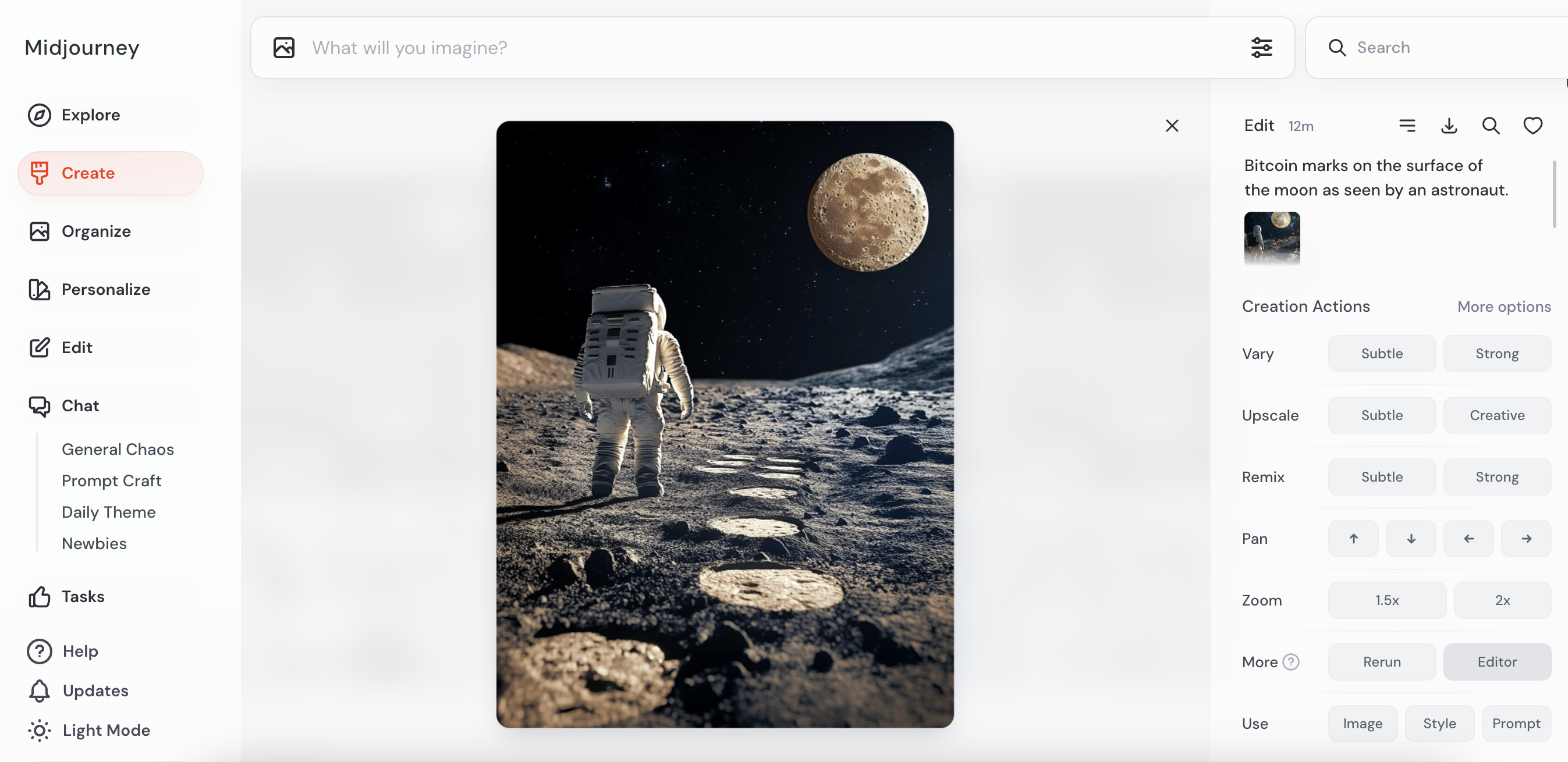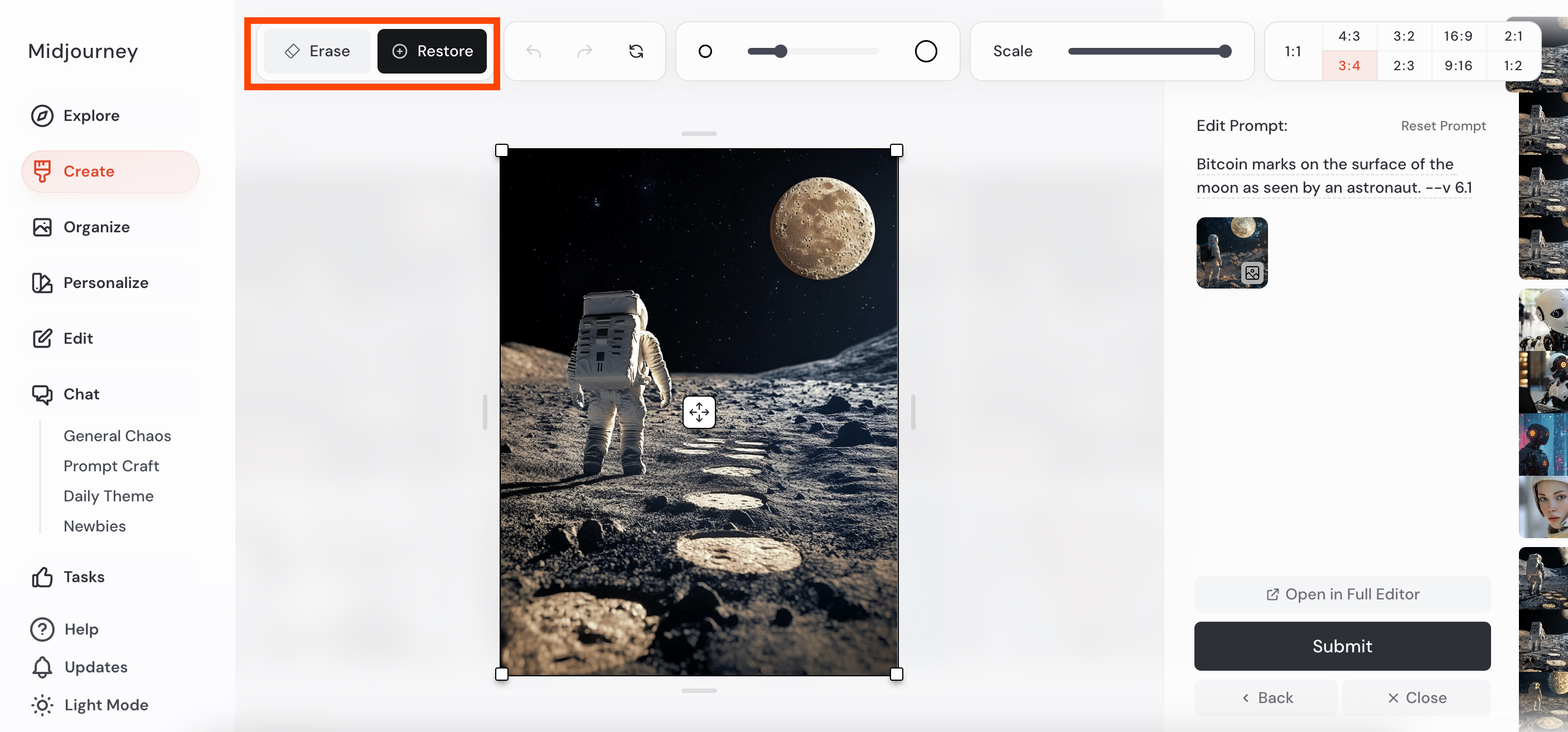 먼저 미드저니 웹버전에 접속한 후 갤러리 페이지에서 수정하고 싶은 이미지를 선택합니다. 이미지를 클릭하면 편집 옵션이 나타나며, 여기서 ‘Edit’ 버튼을 클릭해 이미지 편집 모드로 진입할 수 있습니다.