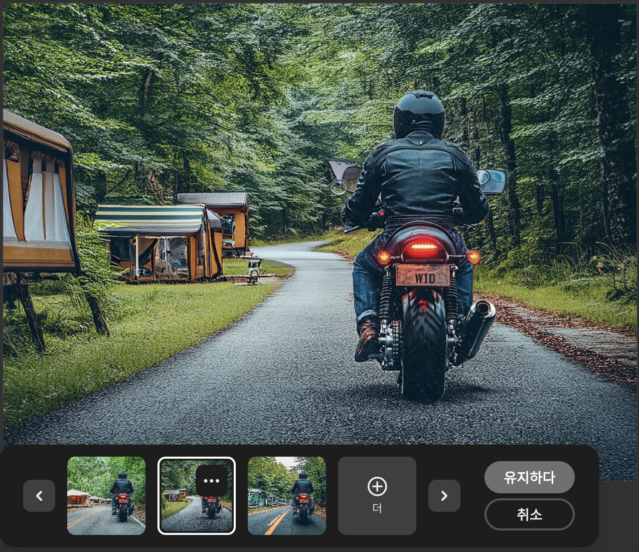 • 프롬프트 입력: “A motorcycle on a forest road with campgrounds on either side.”