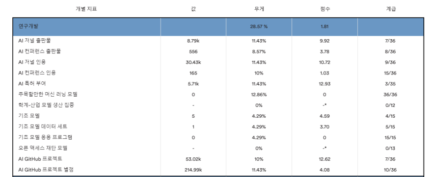 이는 AI 연구 및 논문 발표, 국제 학술대회 참여가 다른 선도국들에 비해 부족하다는 것을 나타냅니다.