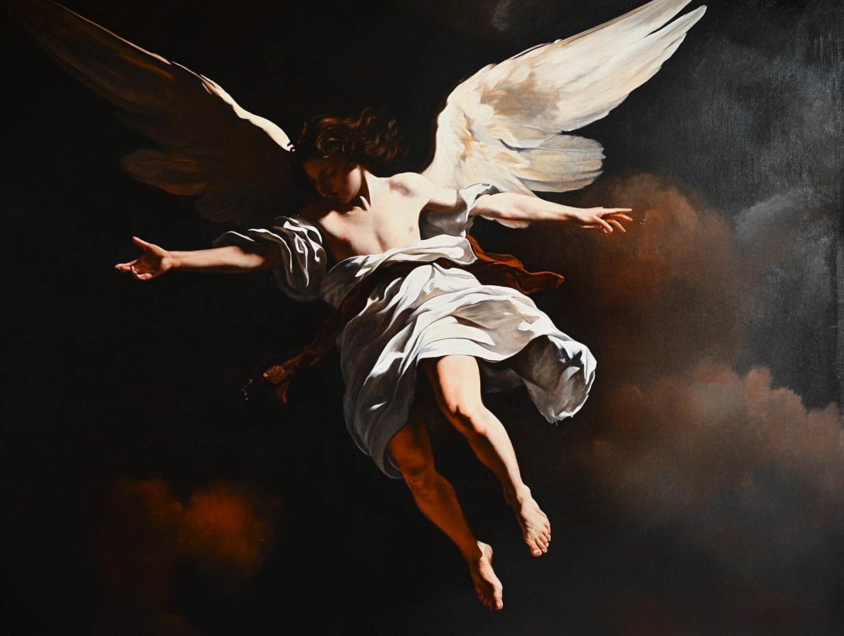 A dramatic Baroque-style scene of an angel descending from the heavens, with intense chiaroscuro lighting and vivid colors, in the style of Caravaggio
