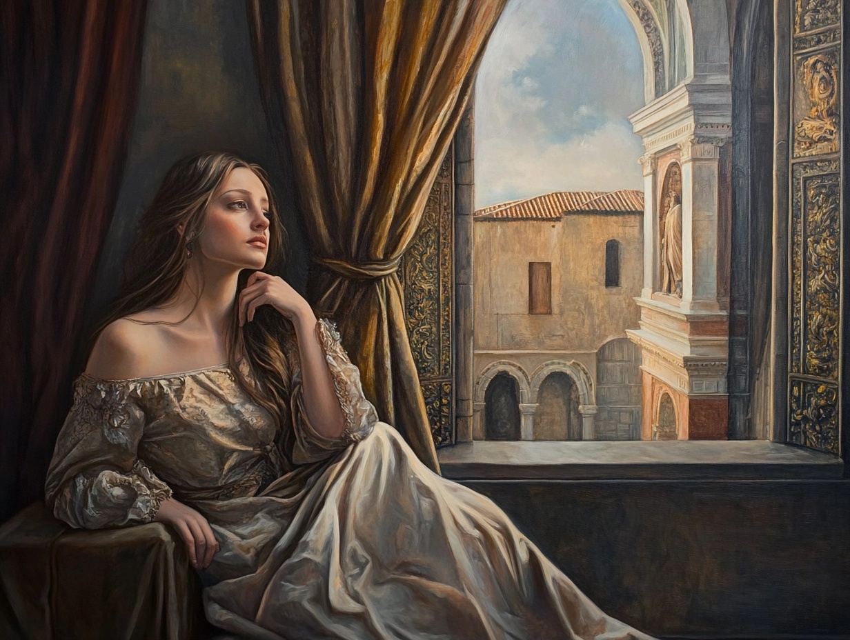 A majestic Renaissance-style painting of a woman sitting by a window, natural light softly illuminating her detailed features, surrounded by classical architecture, in the style of Raphael and Leonardo da Vinci
