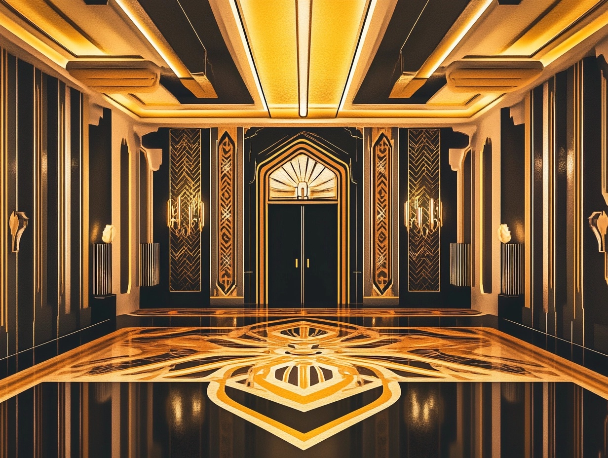 A glamorous Art Deco-inspired scene of a grand ballroom in the 1920s, with intricate geometric patterns and opulent gold and black tones, in the style of the Great Gatsby