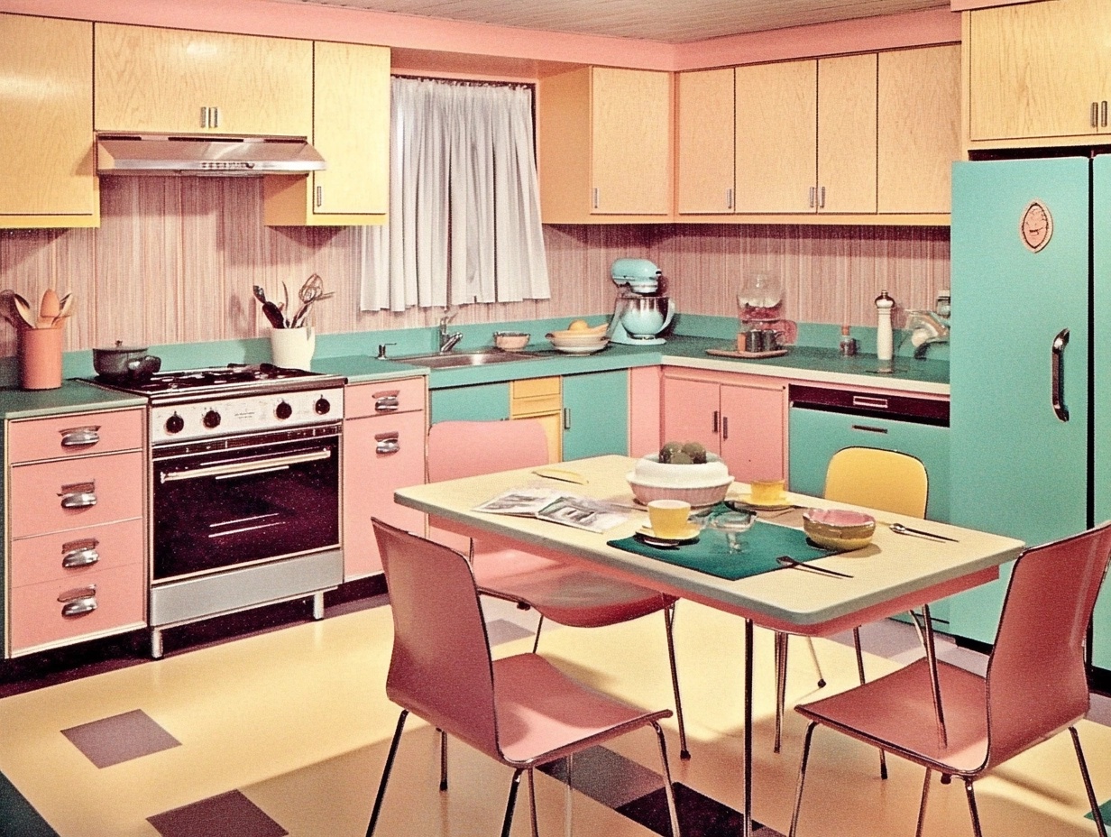 A retro 1950s kitchen with bold pastel colors, sleek appliances, and a cheerful atmosphere, in the style of mid-century modern design