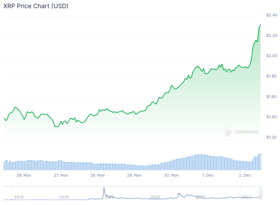 가상자산 시황 데이터 플랫폼 코인게코(CoinGecko)의 12월 2일 기준 데이터에 따르면, 리플의 시가총액은 약 1373억 달러로 전체 3위에 등극했습니다. 이는 이전까지 4위를 지켜왔던 솔라나(약 1090억 달러)를 제친 수치로, 리플이 시장 내 주요 가상자산으로서 강한 입지를 다지고 있음을 보여줍니다.