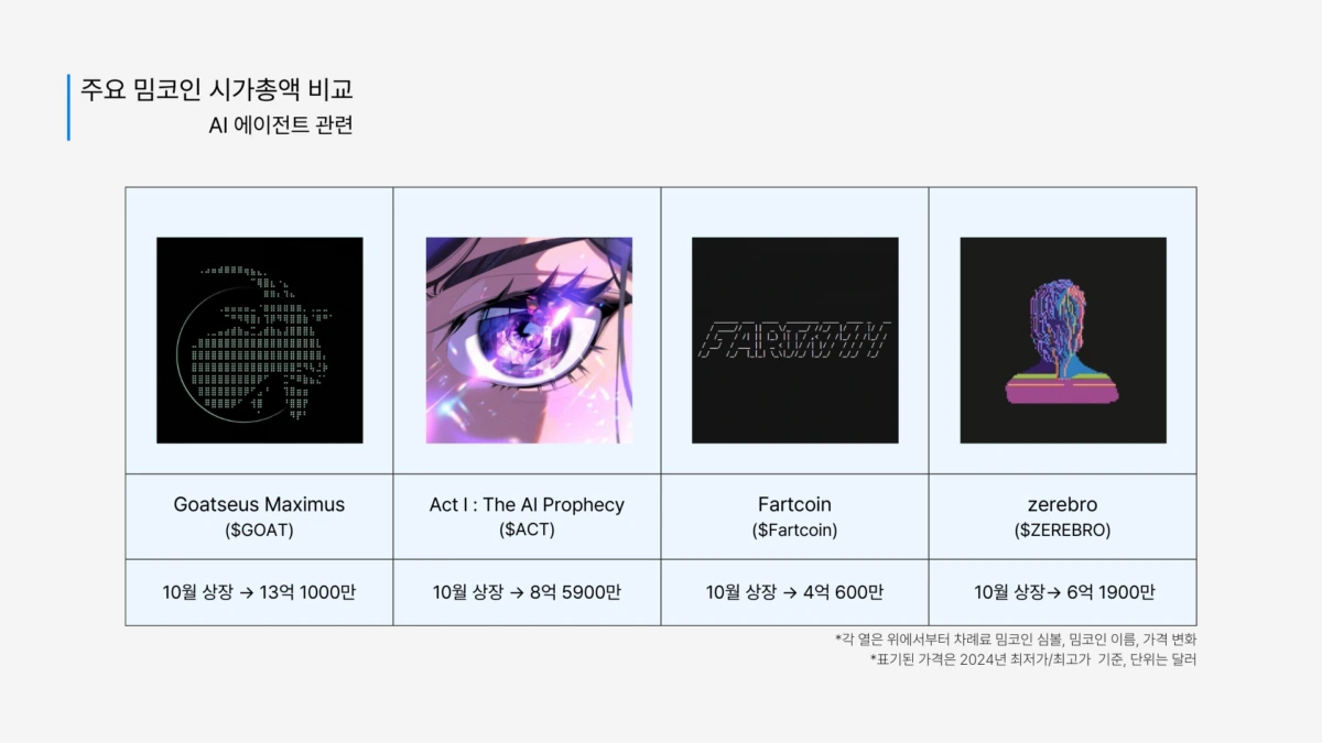 AI와 밈코인의 결합은 2024년 하반기 트렌드 중 하나였습니다. AI 계정 Truth of Terminal(ToT)이 주도한 $GOAT는 단기간에 시가총액 10억 달러를 돌파했습니다.