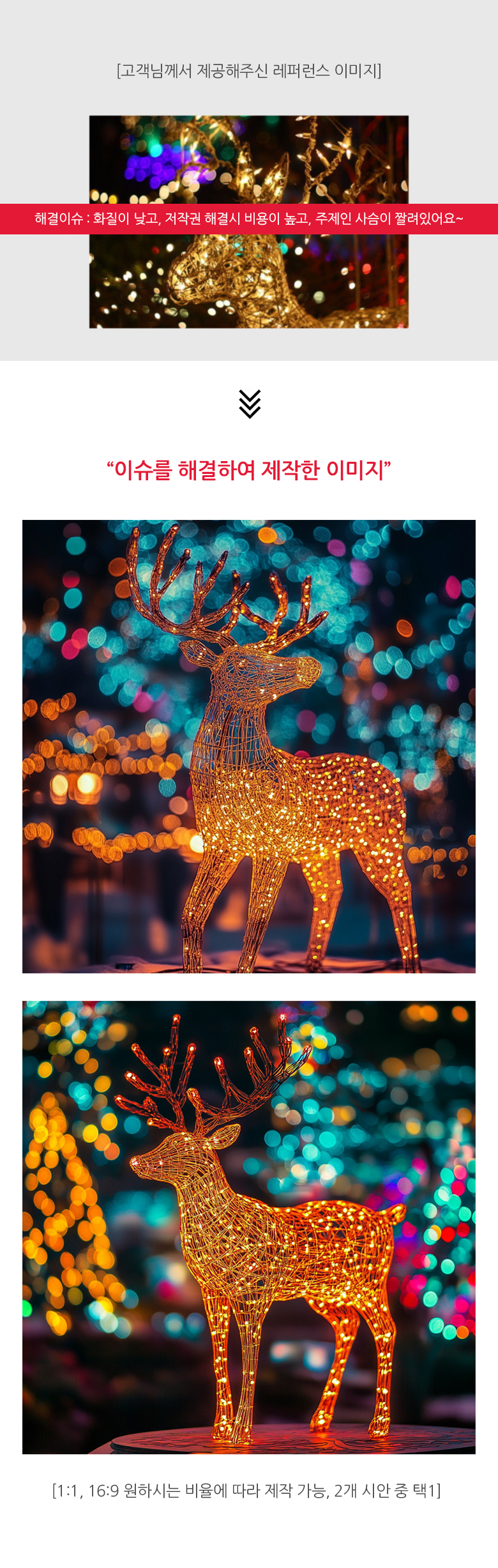 고객님께서 필요로 하는 이미지 자료와 상세한 요구사항을 전달해 주세요. 반드시 비슷하게 제작하고자 하시는 레퍼런스 이미지를 제공해주세요.