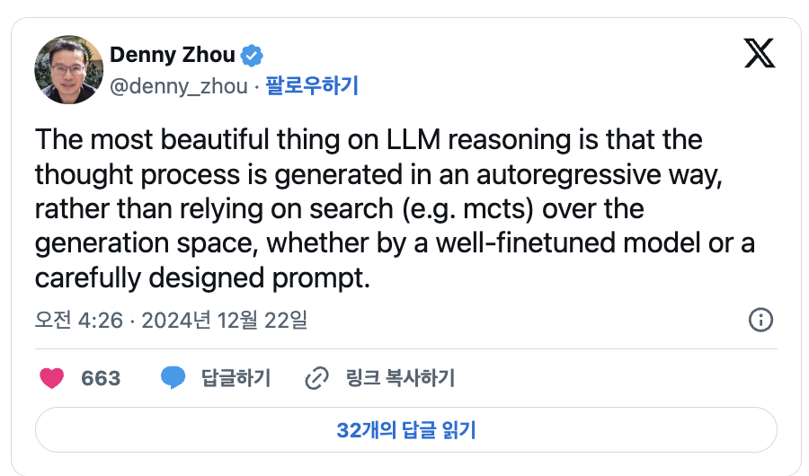 - 구글 딥마인드 연구원 데니 저우는 "o3는 본질적으로 생성 공간에서의 검색(MCTS)에 의존한 방식으로, 인간과 같은 진정한 추론이 아니다"고 비판했습니다.