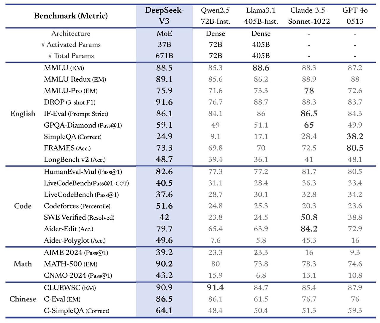 딥시크-V3는 중국어와 수학 중심의 다양한 벤치마크 테스트에서 높은 점수를 기록하며 뛰어난 성능을 입증했습니다.