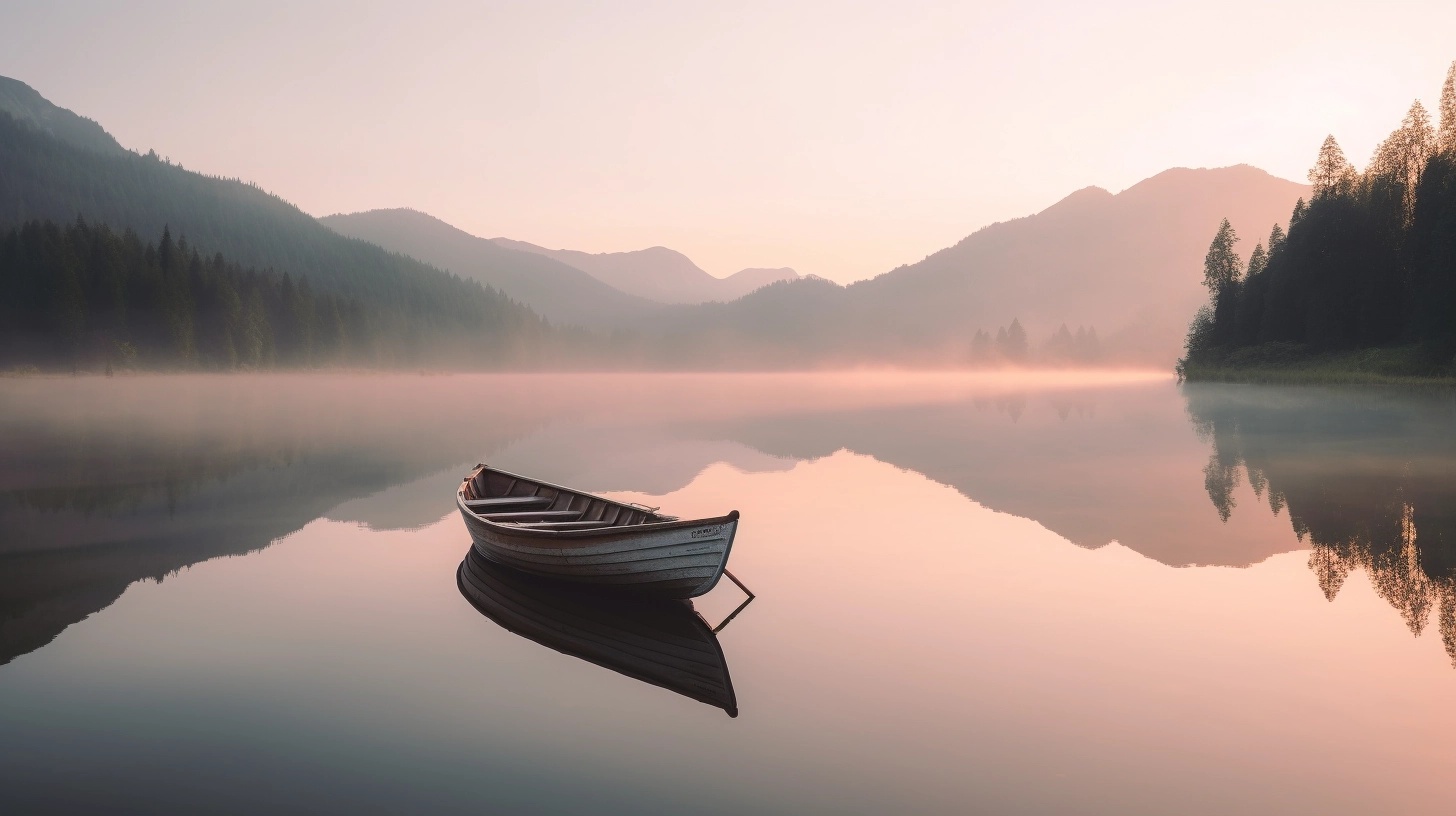 a calm mountain lake reflecting the sunrise, soft pastel colors, gentle mist on the water, a single boat floating quietly, serene composition --v 5 --ar 16:9