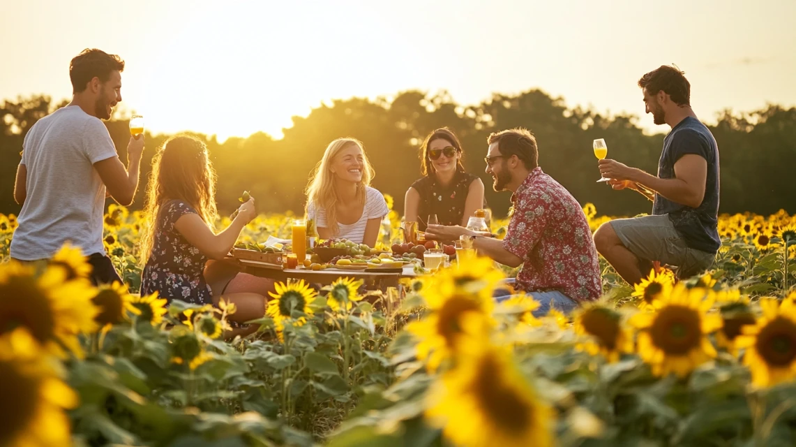 a cheerful summer picnic in a sunflower field, golden sunlight, smiling people enjoying fresh fruits, vibrant colors, cinematic lighting --v 5 --ar 16:9