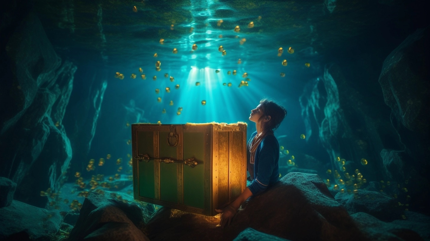 a person discovering a glowing treasure chest in an underwater cave, magical sparkles, vivid blue and gold colors, wide-eyed expression, ethereal light rays --v 5 --ar 16:9