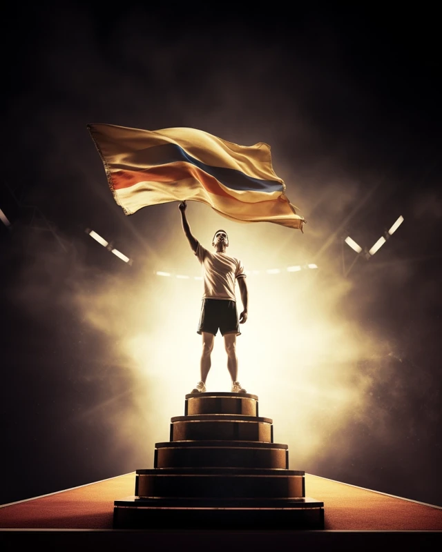a victorious athlete standing on a podium, gold medal shining brightly, dramatic spotlight, flags waving in the background, powerful and proud expression --v 5 --ar 4:5