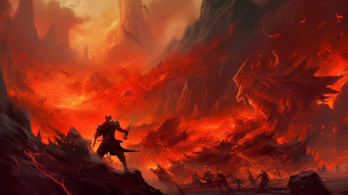 a fiery battlefield with erupting volcanoes, intense red and orange hues, an enraged warrior screaming, dramatic contrast, dynamic composition --v 5 --ar 16:9