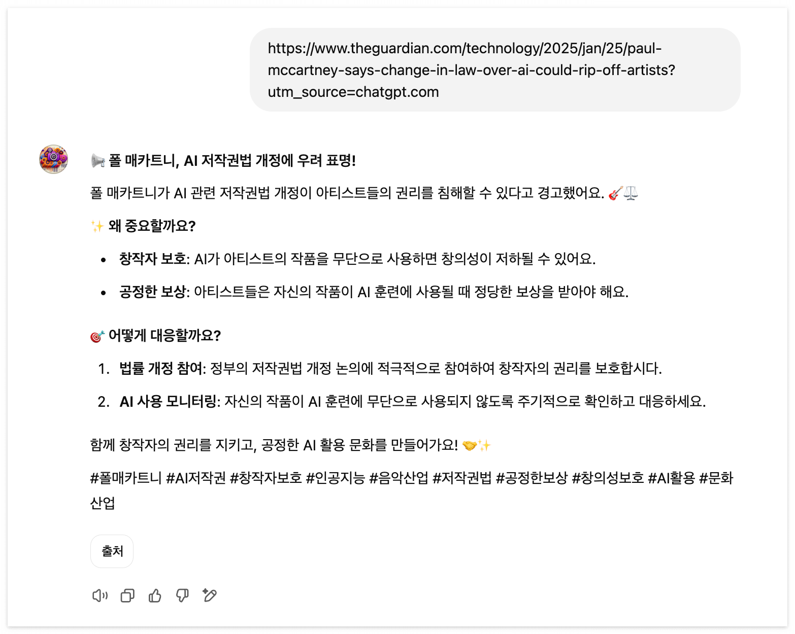 챗GPT는 간단한 입력만으로 매력적인 게시물을 생성합니다. 예를 들어, 브랜드의 핵심 키워드와 게시물의 목적을 입력하면 AI가 자동으로 텍스트를 작성합니다.