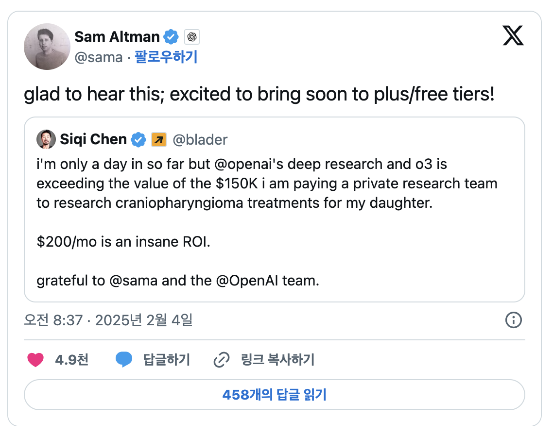 👉 월 200달러의 사용료만으로 방대한 연구 결과를 얻었다는 점에서, 그는 딥 리서치의 가능성에 대해 극찬했습니다.