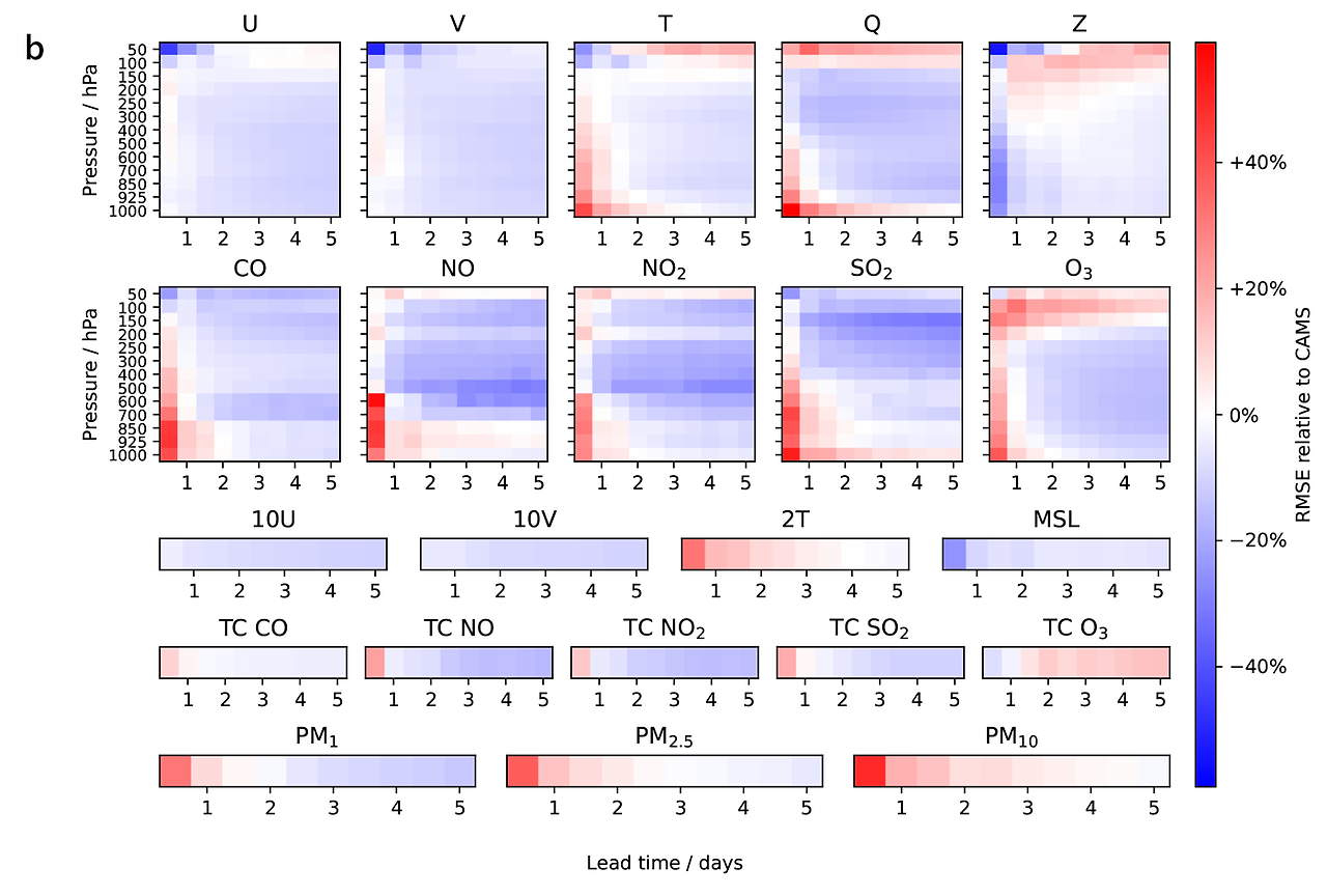 오로라는 동아시아 인구 밀집지의 이산화질소 분포를 정확히 파악하고, 유럽연합(EU) 코페르니쿠스 대기 감시 서비스(CAMS) 데이터와 비교했을 때 평균 제곱근 오차(RMSE)에서도 뛰어난 성능을 보였습니다. 일산화탄소(CO)와 일산화질소(NO) 등 주요 대기오염 지표의 74%에서 CAMS와 동등 이상의 성능을 나타냈습니다.