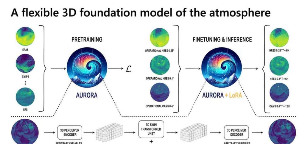 2023년 11월, 유럽을 강타한 태풍 키아란은 기존 기상 예측 모델의 한계를 드러냈습니다. 이에 대응하기 위해 MS는 방대한 대기 데이터를 신속하게 분석할 수 있는 '오로라'를 개발했습니다. 오로라는 100만 시간 이상의 다양한 기상 데이터와 기후 시뮬레이션으로 훈련된 13억 개의 파라미터를 가진 모델입니다.
