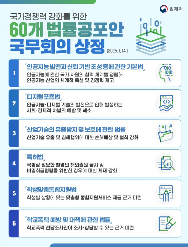 국무회의에 상정된 60개의 법률공포안 중 주요 내용을 정리하여, 대한민국의 미래를 이끌 법률들이 어떤 방향으로 나아가고 있는지 알아봅시다.