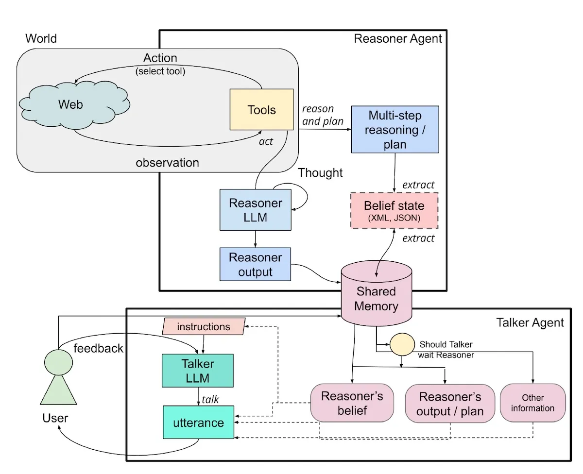 이 이미지는 *토커(Talker)*와 *리즈너(Reasoner)*라는 두 가지 AI 에이전트가 정보를 처리하는 방식을 보여주는 다이어그램입니다. 쉽게 설명하면, 이 두 에이전트는 각자 맡은 역할을 하며 협력하여 사용자와 상호작용하고 필요한 작업을 수행합니다.