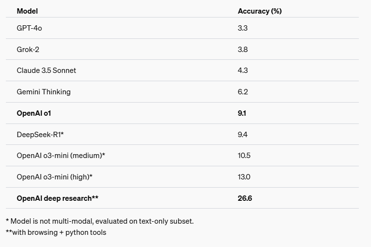 AI 모델의 성능을 평가하는 ‘인류의 마지막 시험(Humanity’s Last Exam, HLE)’에서 딥 리서치는 26.6%의 정확도를 기록하며, 기존 ‘딥시크-R1’ 모델의 9.4%보다 2.8배 향상된 성능을 보였습니다.