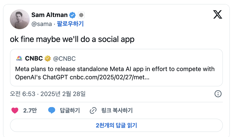 메타의 이러한 움직임에 대해 오픈AI의 샘 알트먼(CEO)은 소셜 미디어를 통해 "그럼 우리는 소셜 앱을 해볼까?"라고 언급하며, AI 시장의 경쟁이 소셜 미디어 분야까지 확장될 가능성을 내비쳤습니다.