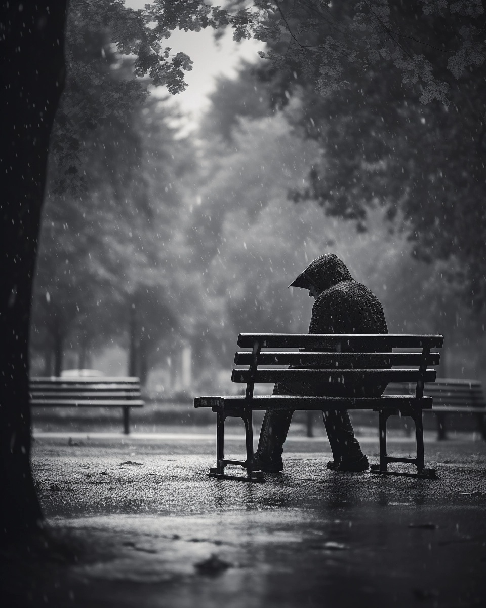 a lonely person sitting on a rainy park bench, grayscale tones, soft light, blurred background, subtle raindrops on the camera lens --v 5 --ar 4:5