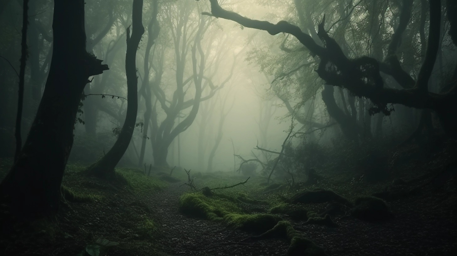 a mysterious haunted forest shrouded in mist, glowing red eyes in the darkness, eerie greenish light, unsettling silence, cinematic horror --v 5 --ar 16:9