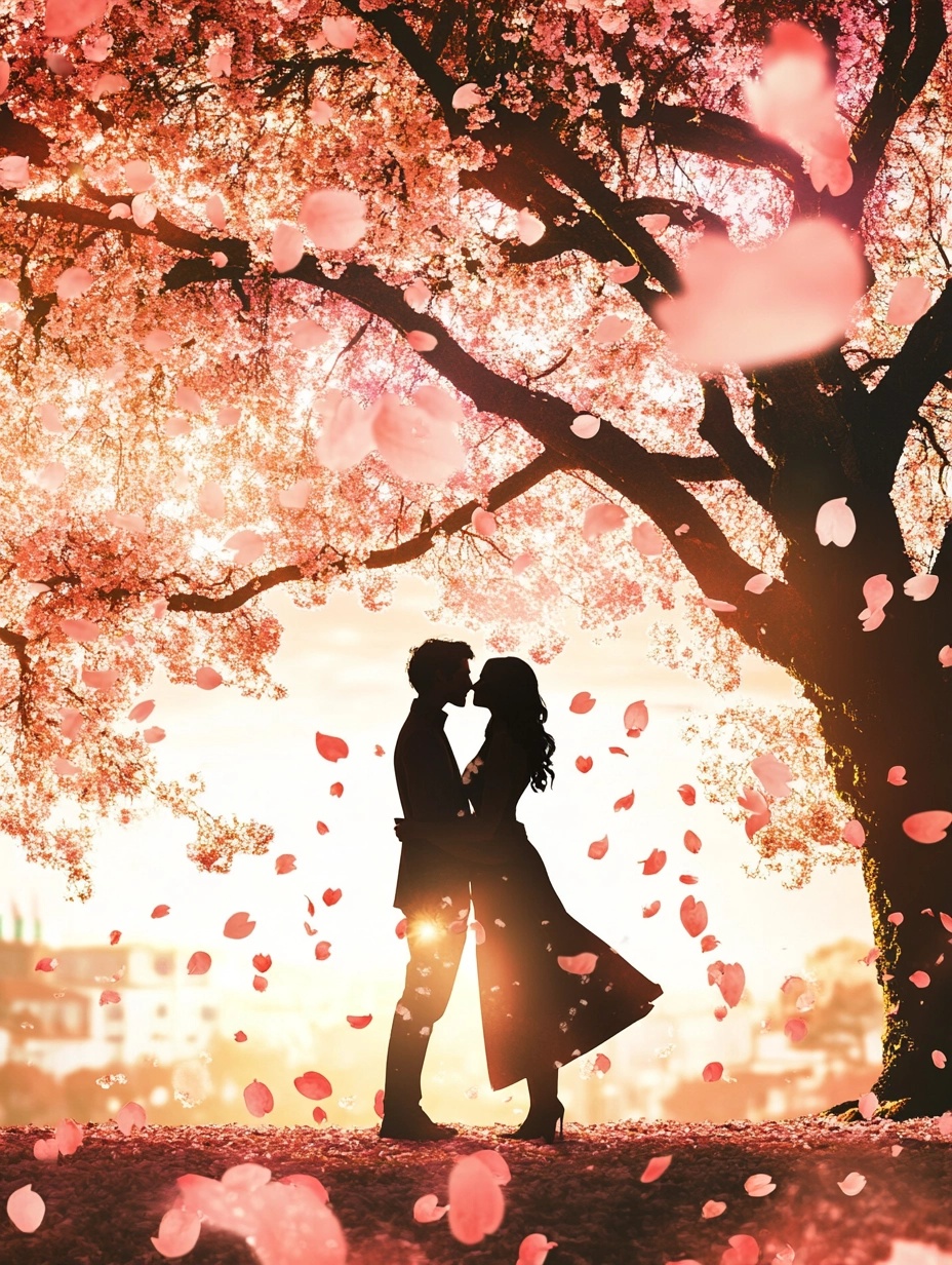 Kissing under a cherry blossom tree Silhouette of a couple in person, falling pink petals, warm golden sunlight, dreamy, bright and romantic atmosphere --v 5 --ar 4:5