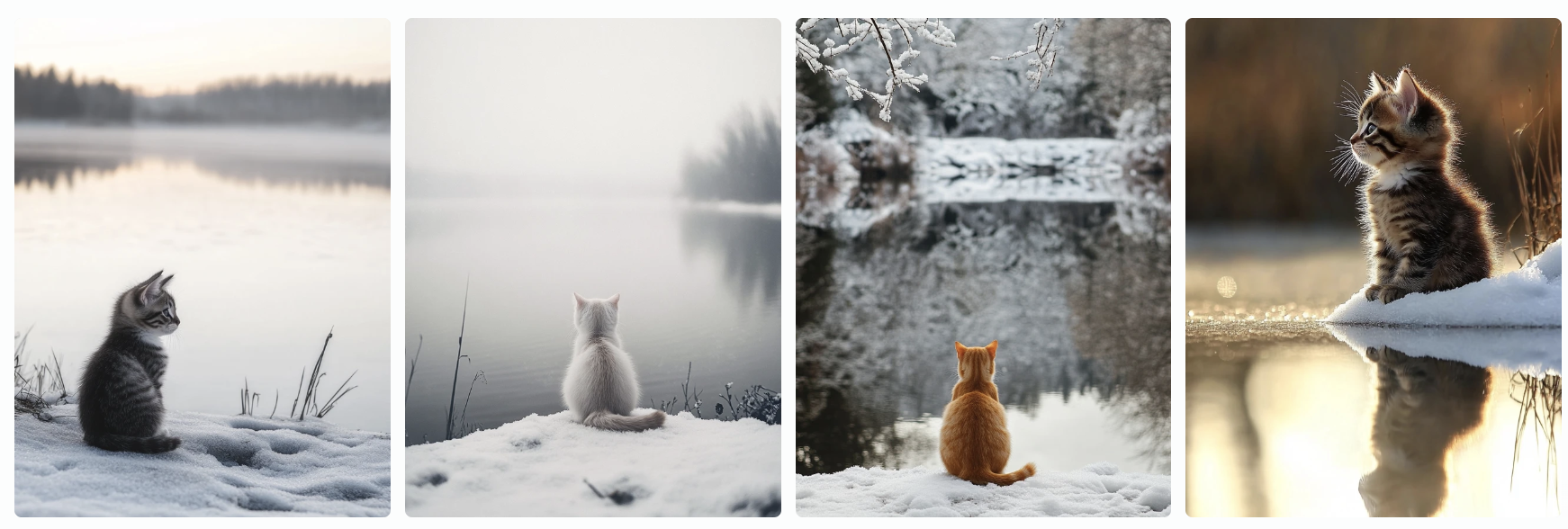 • 프롬프트 예시: “A kitten sitting on the shore of a calm lake, early morning snow when the whole world is white, fresh snow on the ground.”