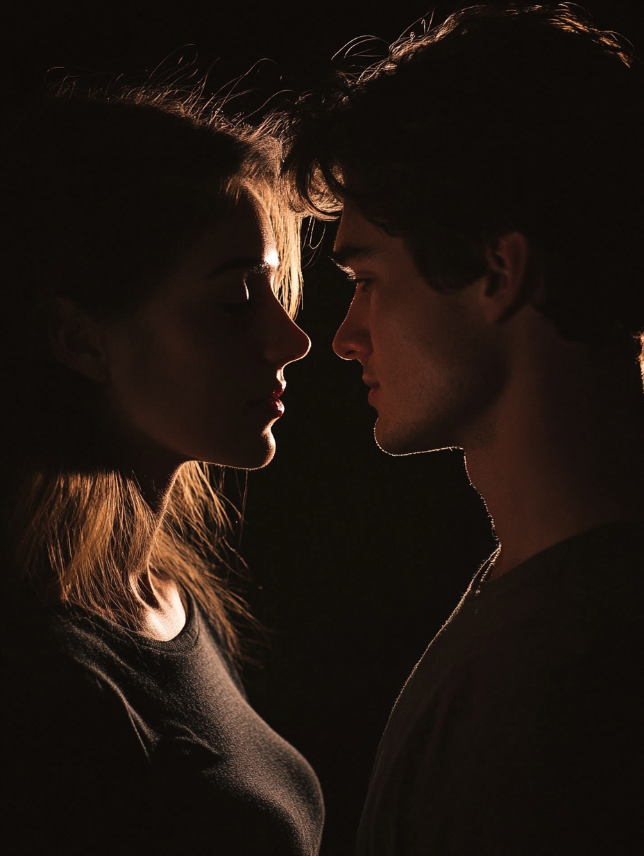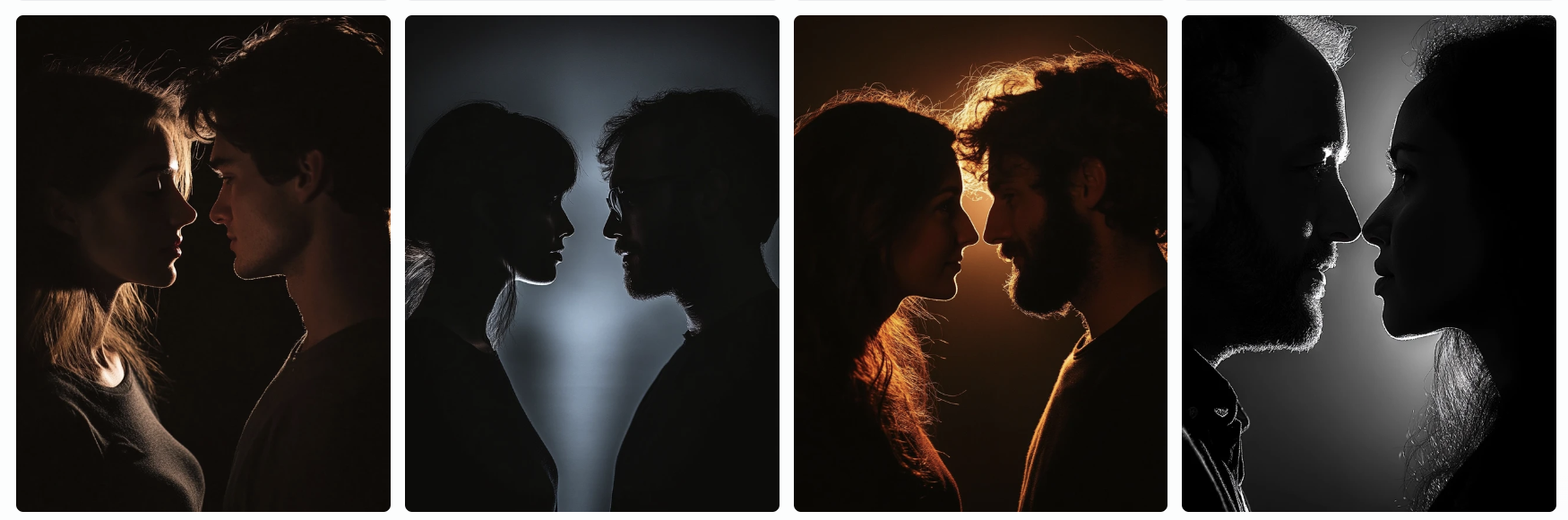 프롬프트 예시 : rim lighting, rim light portrait, man and woman couple face to face, serious conversation, silhouette