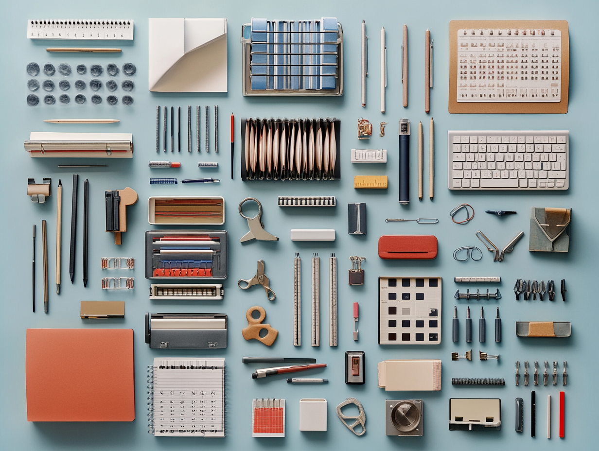 프롬프트 예시 : knolling of office supplies in knolling style, organized layout, Realistic photos