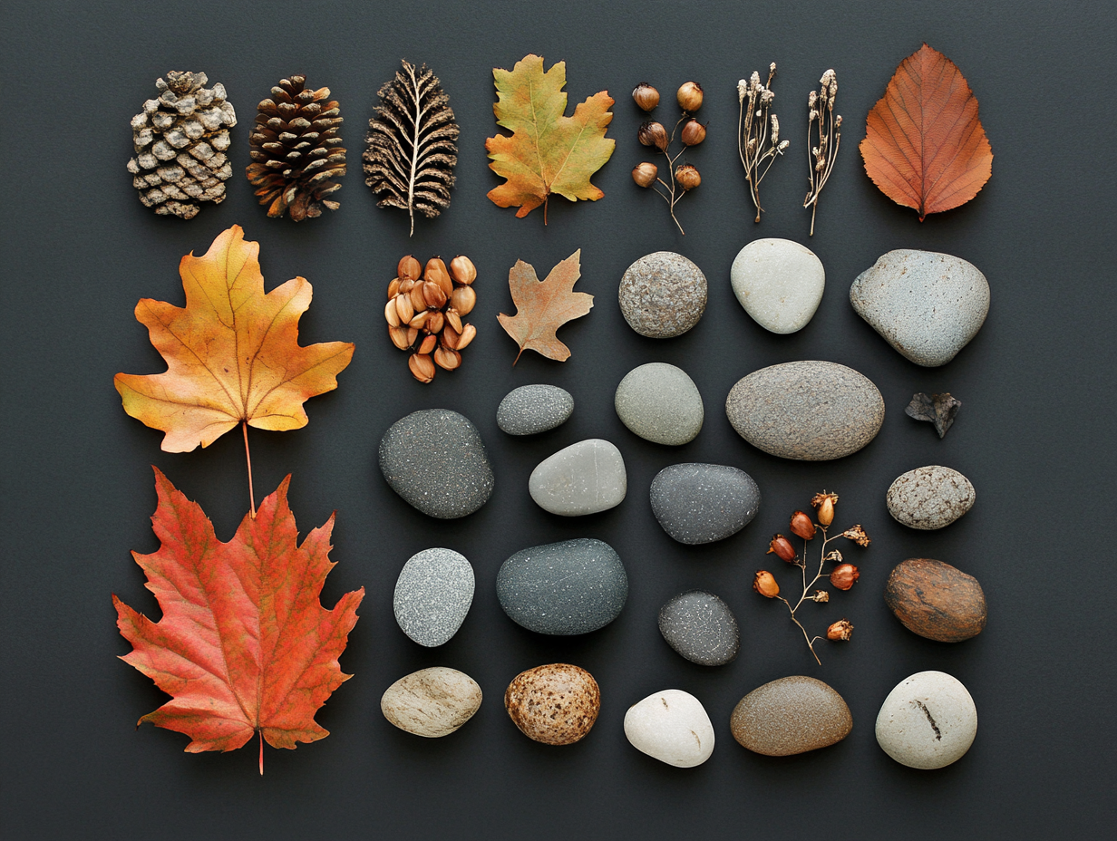 프롬프트 예시 : knolling of natural elements like leaves and stones arranged in knolling style, minimalist, Realistic photos