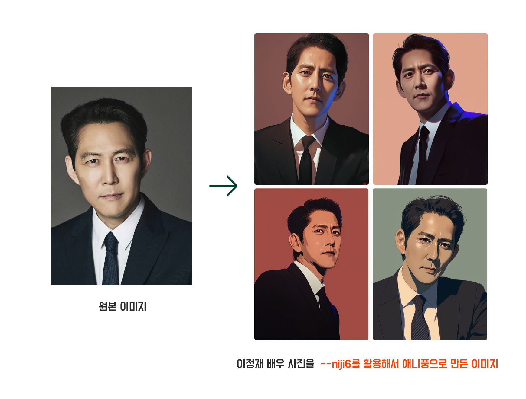 애니메이션풍 스타일을 캐릭터뿐만 아니라 실제 인물에 적용할 수도 있습니다. 예를 들어, 유명 배우의 이미지에 Niji6 모드를 적용하면, 애니메이션에서 등장할 것 같은 과장된 얼굴 윤곽과 화려한 의상 스타일로 변환됩니다. 프롬프트에 ‘stylized anime version of a famous actor’라고 입력해보세요. 이처럼 Niji6는 특정 인물의 사진에 애니메이션 스타일을 더하는 데 매우 유용합니다.