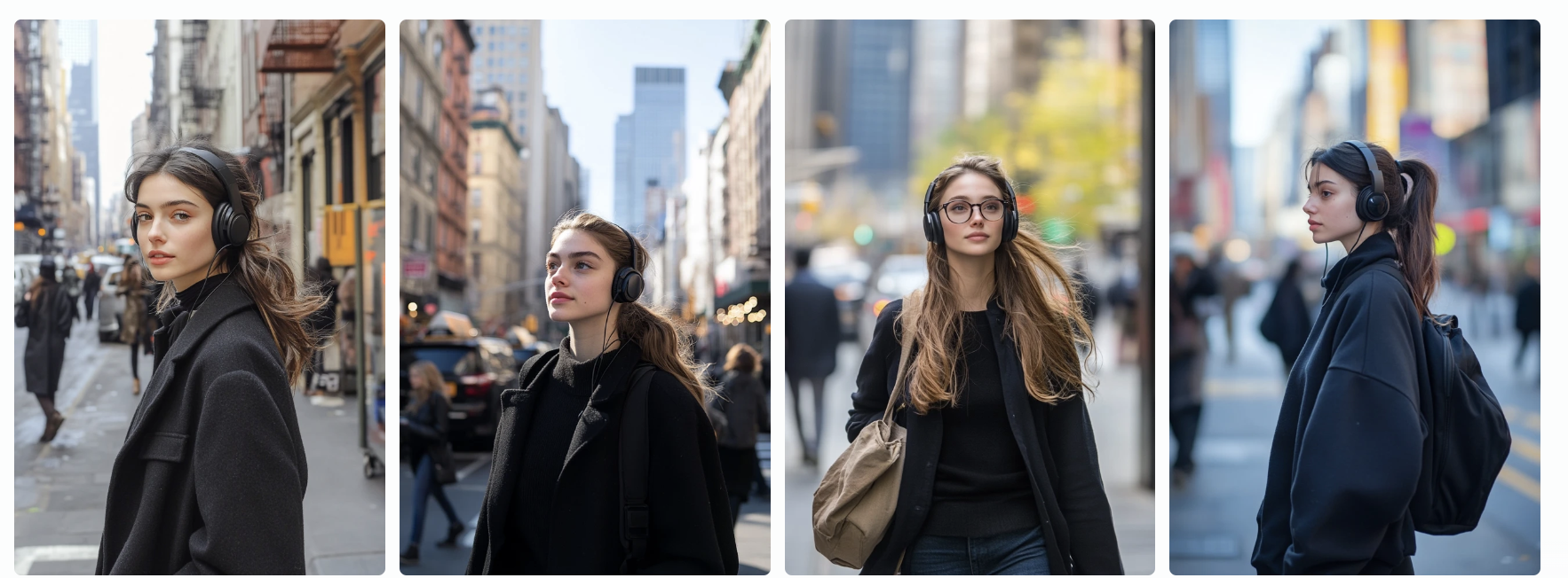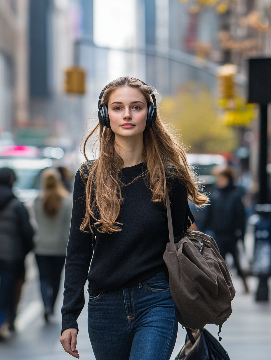 20-year-old woman walking down a hip New York street wearing a headset, side angle shot --ar 2:3 --seed 2906684585 --v 6.1
