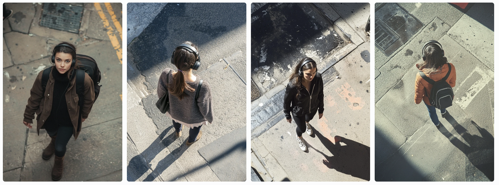20-year-old woman walking down a hip New York street wearing a headset, high angle shot --ar 2:3 --v 6.1 --seed 2906684585