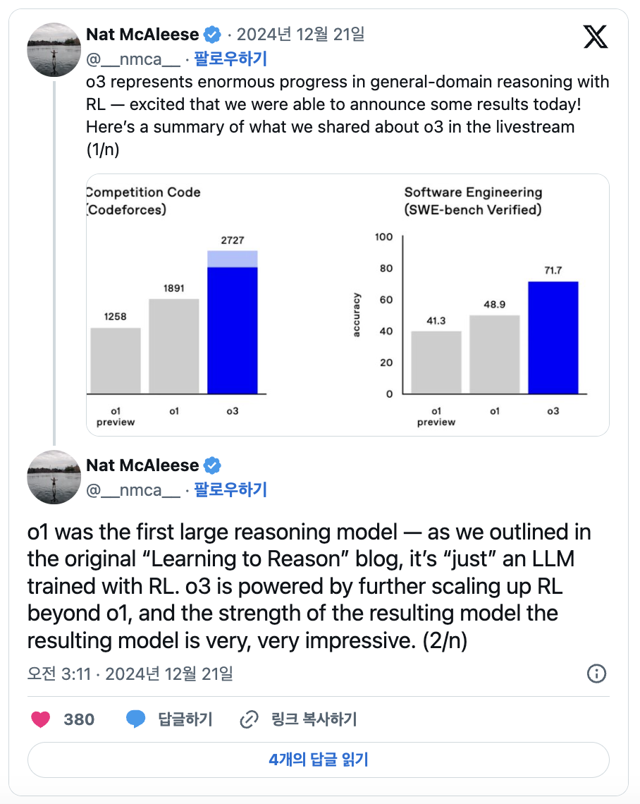 - 오픈AI 연구원 냇 매칼리스는 "o3는 기존 o1 모델의 RL 방식을 더욱 정교화한 결과일 뿐"이라고 밝혔습니다.