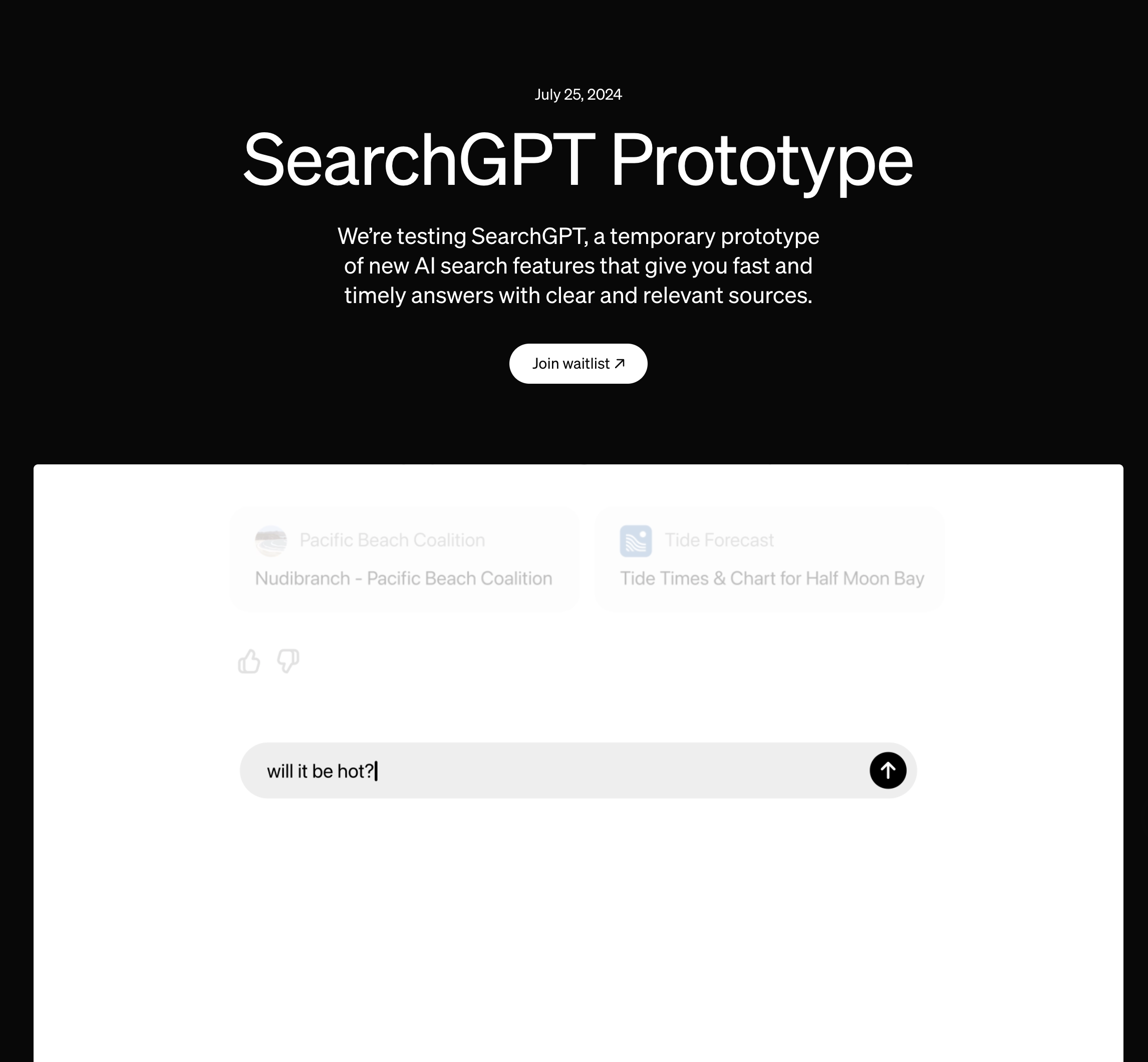 오픈AI는 25일(현지시간) 공식 블로그를 통해 '서치GPT'의 프로토타입 버전을 개발했다고 발표했습니다. 이번 발표는 우선 소규모 테스트 그룹과 퍼블리셔들을 대상으로 진행되며, 정식 출시 일정은 아직 공개되지 않았습니다. 초기에는 대기자 명단에 등록한 사용자만 사용할 수 있습니다.