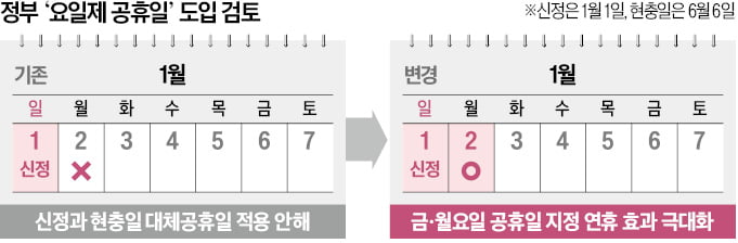 최근 정부는 공휴일 제도를 기존의 날짜 중심에서 요일 중심으로 바꾸는 '요일제 공휴일' 도입을 검토하고 있습니다. 이로 인해 신정(1월 1일)과 현충일(6월 6일)이 주말과 겹칠 경우 대체공휴일을 지정하고, 월요일이나 금요일에 공휴일을 배치해 연휴 효과를 극대화하려는 방안이 논의되고 있습니다.